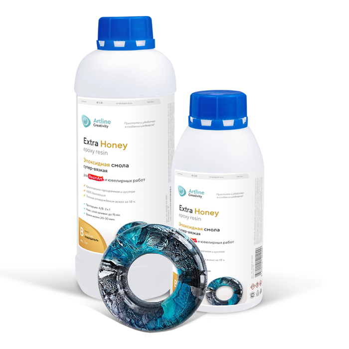 Artline Extra Honey – супер-вязкая эпоксидная смола, еще более густая чем обычная Honey. Имеет более низкий срок жизни – до 20-30 минут, поэтому работу с ней нужно проводить незамедлительно. Предназначена для создания изделий с высоким куполом и рисования, т.к. из за ее густоты краски не смешиваются быстро в однородную массу. Соотношение смолы с отвердителем – 2 к 1.